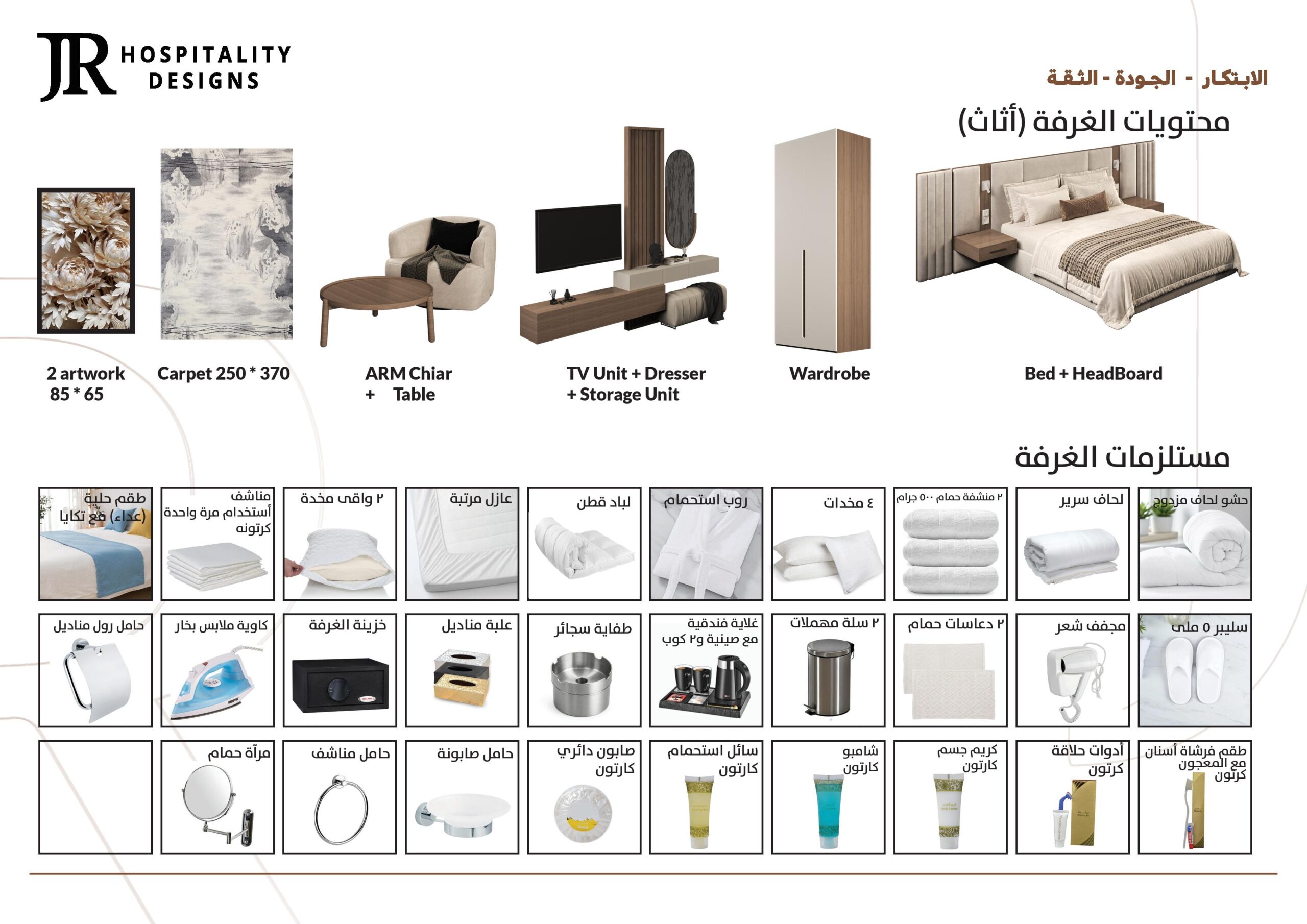 تصميم يجمع بين البساطة الراقية والفخامة الهادئة، بخطوط هندسية ناعمة وألوان ترابية دافئة. تبرز الاحترافية في تناغم الأقمشة، وتوزيع الإضاءة، وتفاصيل الأثاث المصمم بدقة لتلبية متطلبات الضيافة العصرية. كل زاوية في هذا التصميم تعكس تكامل فندقي مدروس بعناية.